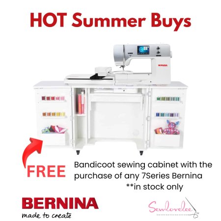 Your new machine deserves a designated sewing cabinet. Receive the Bandicoot sewing cabinet for FREE with the purchase of any 7 series Bernina.