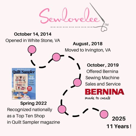 Sewlovelee officially opened its doors as a brick-and-mortar quilt shop on October 14th, 2014 in White Stone. For more than a decade, Sewlovelee has been here to support your quilting journey—offering everything from fabric, thread, and notions to classes, sewing machine sales and service, longarm quilting, and inspiration. Thank you for stitching this journey with us. Here’s to 11 years together—and many more quilts, memories, and celebrations to come!