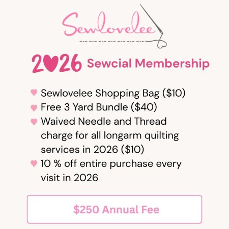 These discounts will add up quickly for you and can be used throughout the calendar year 2026. Get your Sewlovelee Sewcial Membership before January 31st.