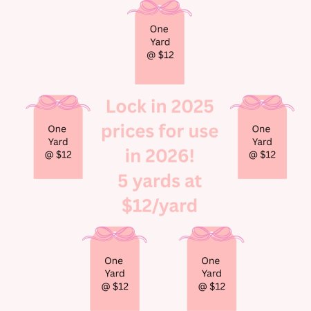 It’s a fact; prices are increasing across the board. Before we head into the new year, lock in 2025 prices for 2026 purchases of fabric by pre-purchasing! Get 5 yards at 2025 pricing of $12 per yard. Purchases must be made in store, and some exclusions may apply.