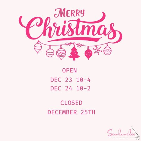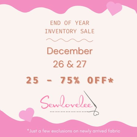 Sewlovelee will be OPEN December 26th from 10-4 and December 27th from 10-2 for our first-ever End-of-year Inventory reduction sale. You will find 25-75% OFF most items in the store. Newly arrived fabric is excluded, but that’s it!