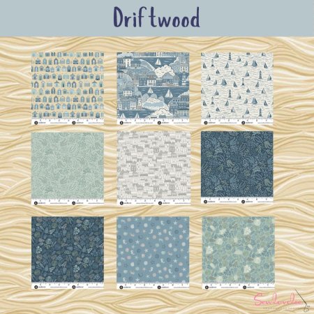 Elegant line drawings of seaside coves, beach huts, sailboats and seashells combine to make Driftwood a dreamy nautical collection. What new projects will you dream up?