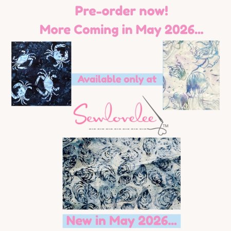 Pre-order Sewlovelee’s nautical navy crab, rainbow jellyfish, and oyster batik for delivery in May.